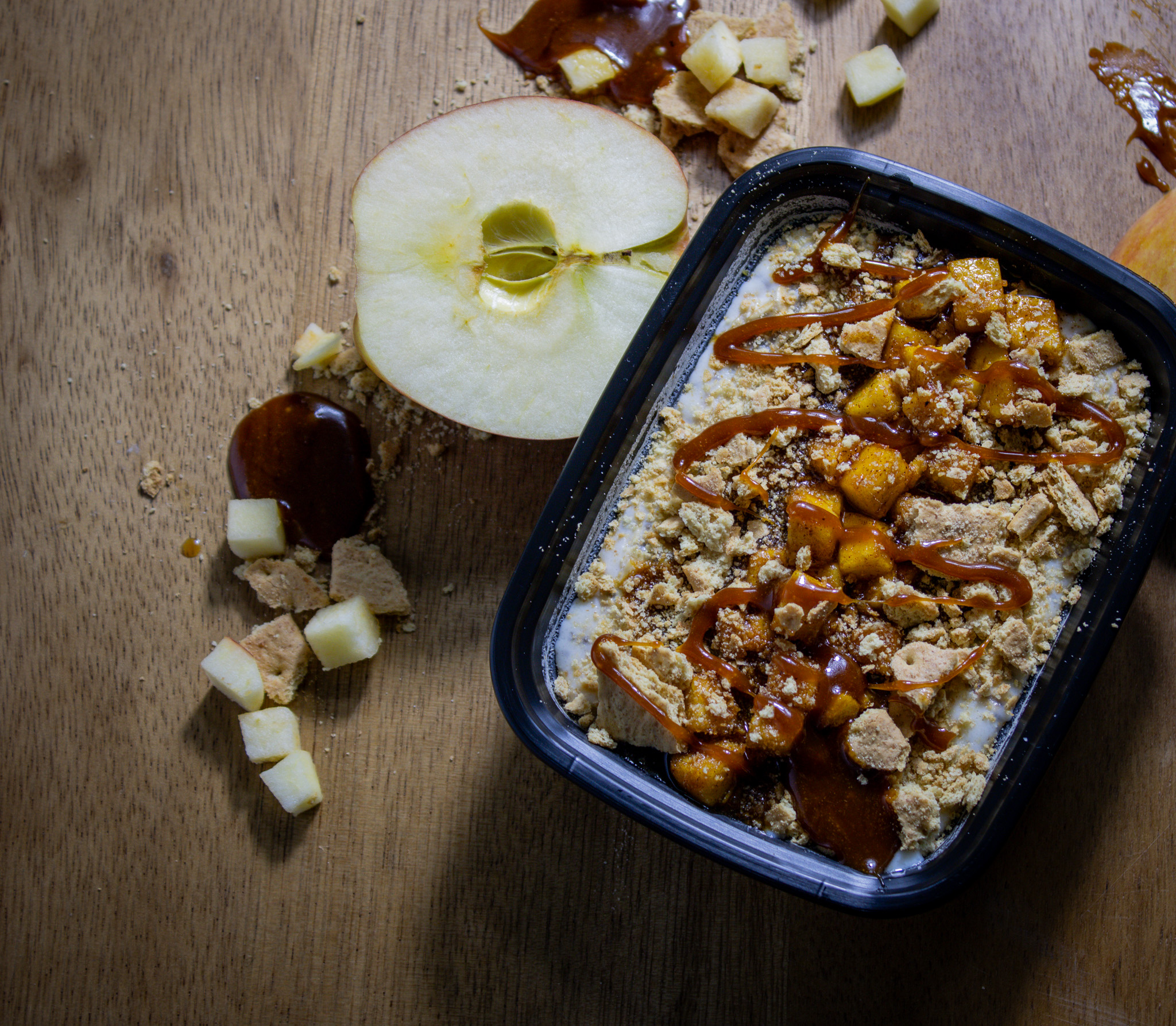 Rolled Oats, chai seeds, whey protein isolate, 1% milk, Greek yogurt, graham cracker, caramel drizzle, and pecans.