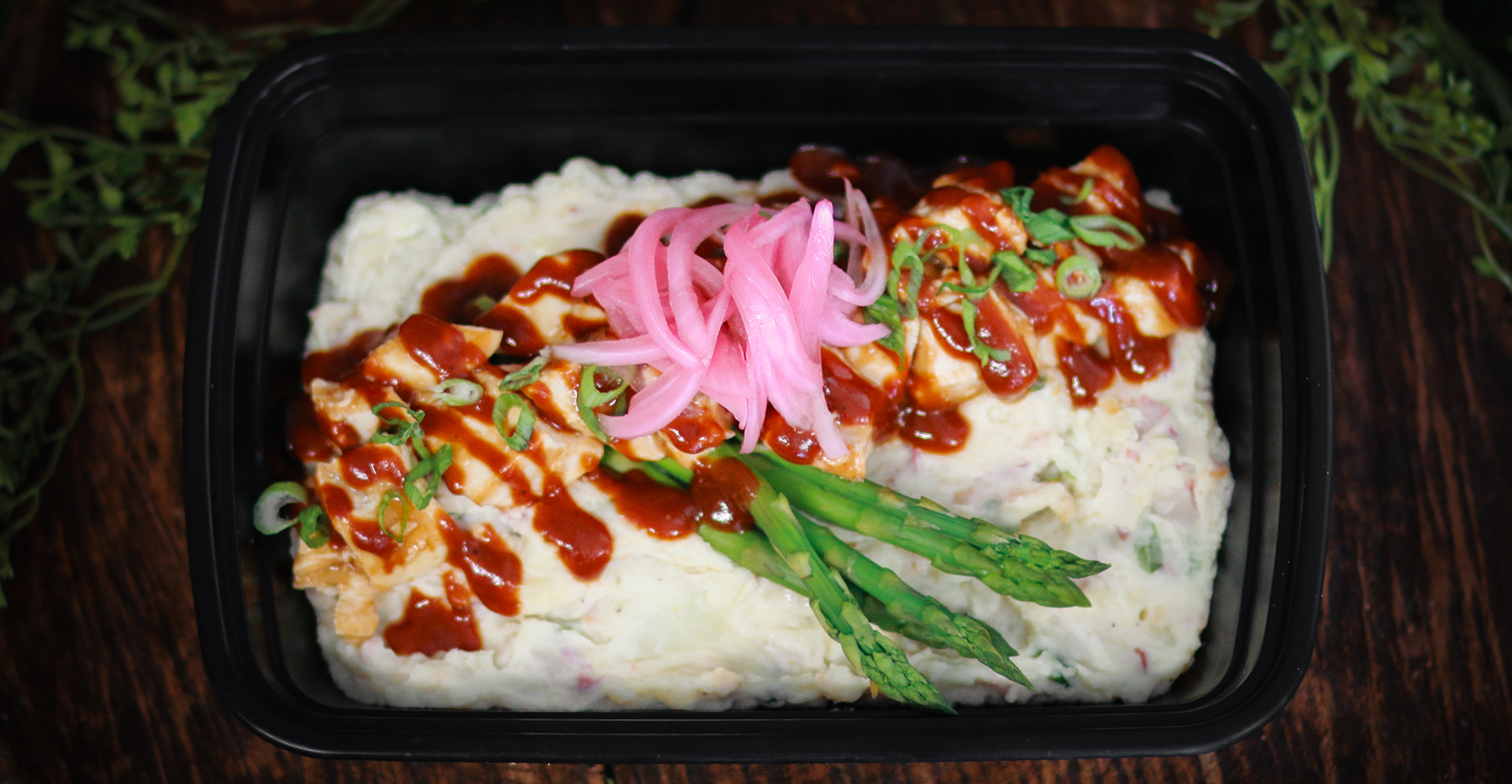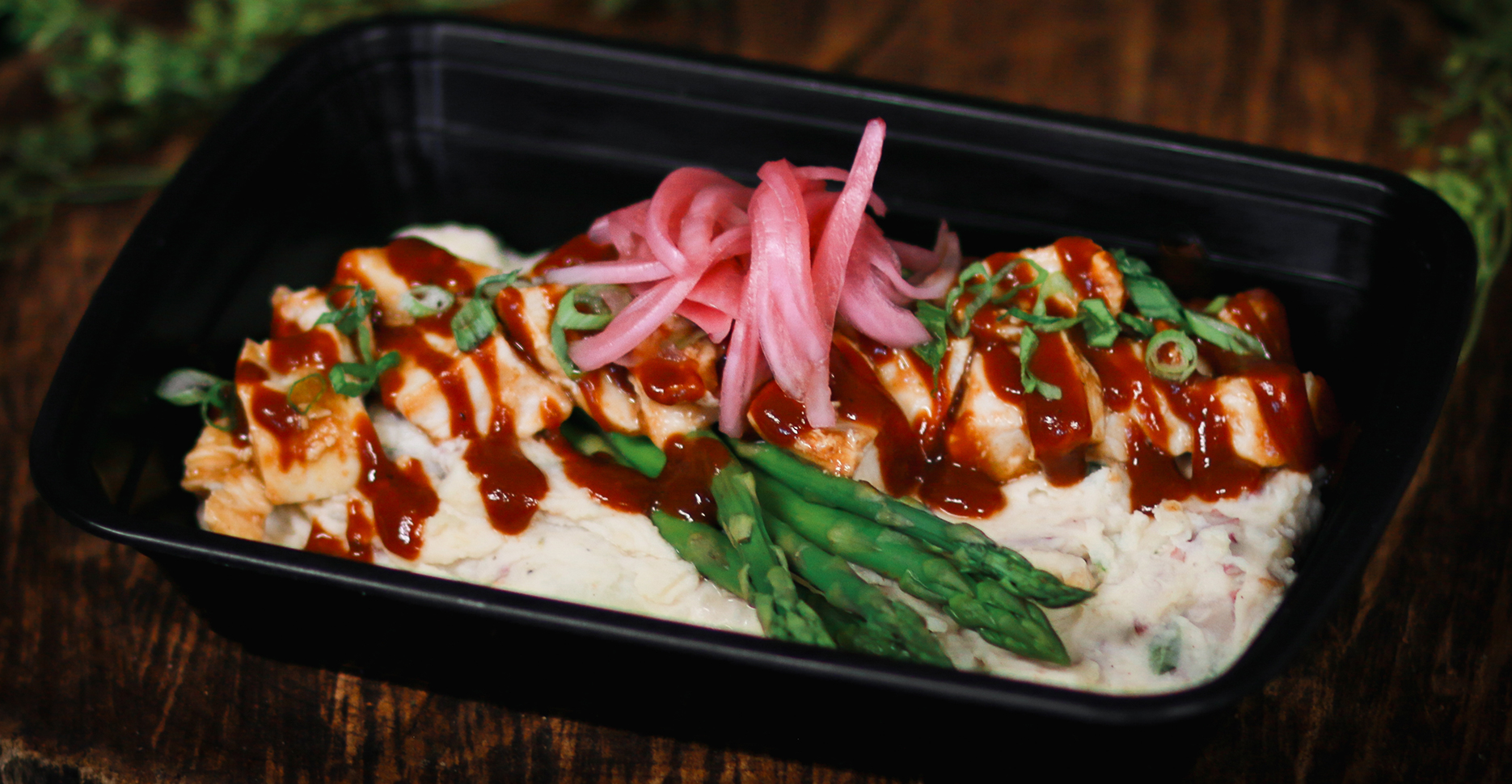 Loaded red skin potato mash topped with chunks of tender grilled chicken breast glazed with sugar free bbq sauce and finished with pickled onions, served with a side of sauteed asparagus.