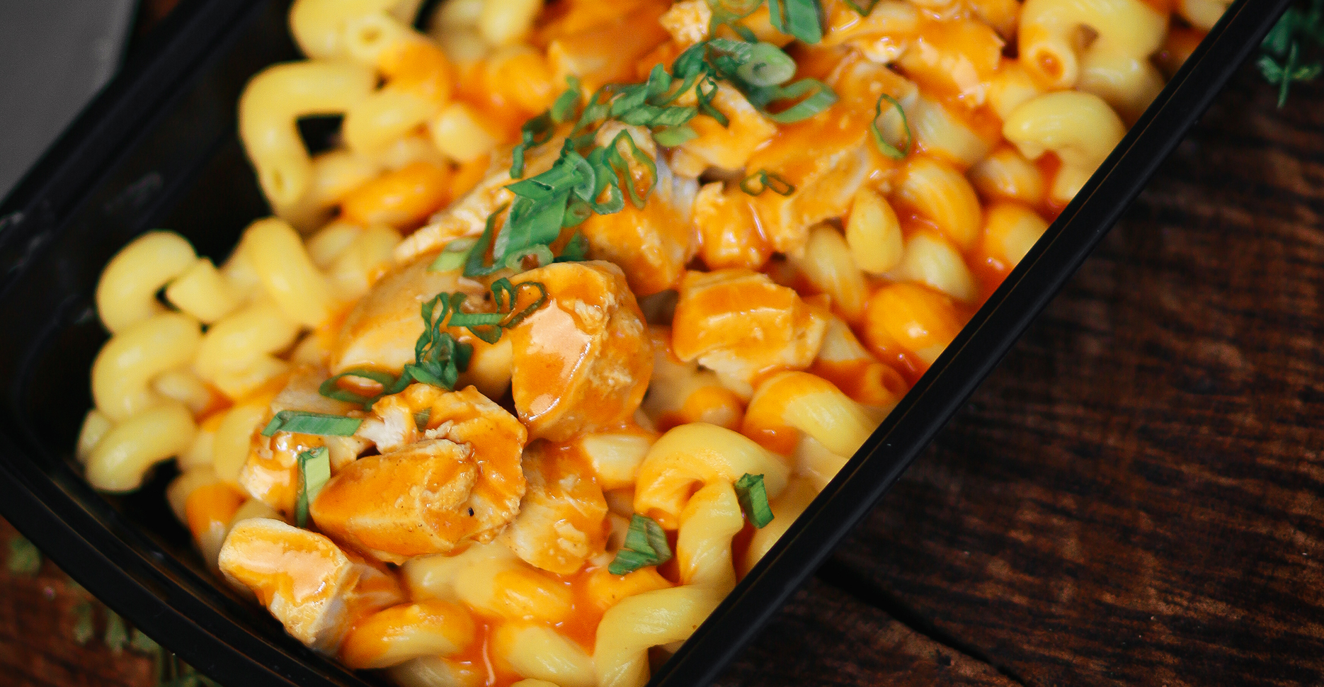 Cavatappi pasta cooked into a high protein 4 cheese sauce topped with tender chunks of grilled chicken, drizzled with zesty buffalo sauce and finished with green onions.