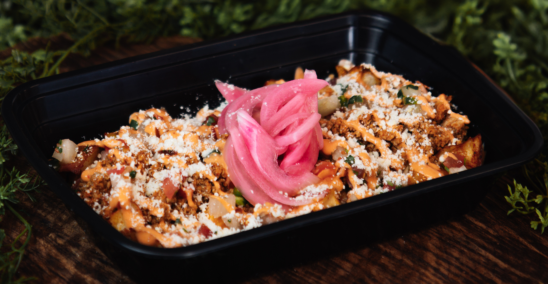Roasted red bliss potatoes, house-made chorizo style lean ground turkey drizzled with creamy chipotle sauce and finished with cotija and fresh pico de gallo.