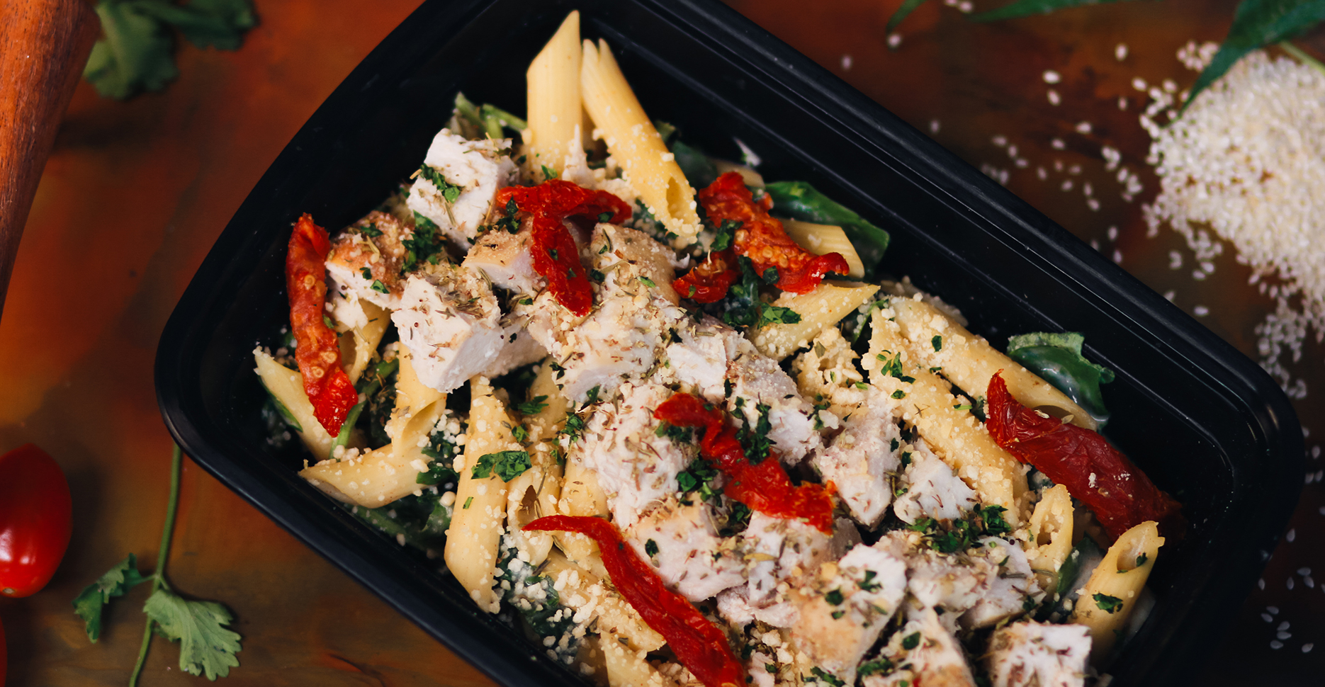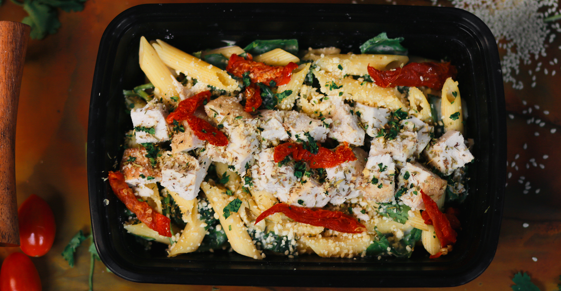 A High protein, low fat creamy sauce with penne pasta with sauteed spinach, with a herb chicken breast, garnished with sundried tomatoes and parmesan.